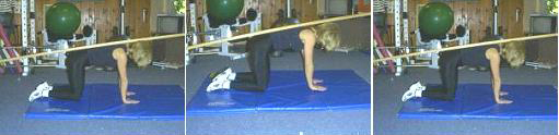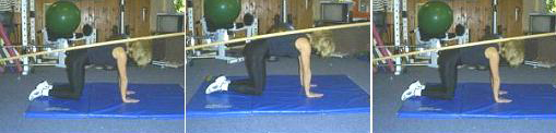 This exercise is great for isolating the transverse abdominis, for correcting "pooch belly," and reconnecting with the nervous system. It is particularly valuable for pre-surgery preparation and post-surgery rehabilitation. In surgical procedures such as caesarean section and hernia, the muscles, nerves, and tissues are cut, causing a loss of neurological impulse (your brain tries to call your muscles to wake them up, but the muscles don't answer!). Lack of neural drive to the core muscles is one reason for the belly hanging out. Certain exercises can help reconnect the nervous and muscular systems so your "pooch belly" gets the message from the brain loud and clear and pulls those muscles in. NOTE: Using a dowel rod can help you keep good neutral exercise posture and provide biofeedback (as the rod touches different parts of your body, it makes you aware of your body position). If you use the dowel technique, place the rod along your spine, making sure the back of your head, upper back, and tailbone are in contact with the rod. Position: Get down on all fours as though you were going to crawl. Place your hands directly underneath your shoulders and your knees directly underneath your hips. Movement: o Inhale and allow the transverse abdominis to hang out towards the floor. Horse Stance Vertical The first exercise in the Horse Stance series is the Horse Stance Vertical, which integrates the stabilizer muscles of your spinal column with the other muscles of the inner unit. It targets the inner unit (multifidus, pelvic floor, transverse abdominis, diaphragm). Position: Get down on all fours with your hands directly underneath your shoulders and your elbows slightly bent.Your knees should be directly underneath your hips at a 90-degree angle. Movement: o Raise your left hand and right knee approximately one centimeter off the ground (that's about the thickness of the sheet of paper-look closely at the center photograph and you will see the hand slightly off the matt. The right knee is also raised slightly off the matt, although it cannot be seen in the photograph). Hold this position for 10 seconds. o Repeat with the right hand and left knee. Pelvic Tilt This exercise increases lower abdominal muscle control, including the transverse abdominis. These are important muscles to integrate to eliminate pooch belly. Position: Lie on your back on an exercise matt or comfortable surface with your feet about 6-8 inches away from your gluteus maximus (buttocks). Movement: o Contract the lower abdominals and gently press your lower back toward the floor. Avoid contracting your rectus abdominis (your six-pack muscles) while doing this integration exercise. This exercise can be very difficult at the beginning, so have patience. Optional: If you have one, you can also use a blood pressure cuff for good biofeedback. Place the cuff beneath your back directly under your belly button and pump the cuff to 40 mm Hg. Take a deep diaphragmatic breath and, slowly exhaling, draw your belly button in toward your spine. Contract your lower abdominals so the blood pressure cuff reads 70 mm Hg. If you do not have access to a blood pressure cuff, just fold a towel until it is the thickness of your hand and place it under your lower back. When your skin comes in contact with the towel, it will send a signal to the brain about how hard you are pushing down. Remember Avoid all rectus abdominis involvement in this exercise. Heel SlidesNOTE: This exercise requires a blood pressure cuff. Heel slides are a great integration exercise for the inner unit, lower abdominals, and lower extremities (your outer unit). Position: Lie supine (back down, face up) on the floor with your shoes off. Bend your hips and knees, placing your heels about 8 inches from the buttocks. Keep your spine in a neutral position. Place a blood pressure cuff under your lumbar spine. Pump the blood pressure cuff up to 40 mm Hg and take a deep diaphragmatic breath. Movement: o Slowly exhale and draw your belly button in toward your spine. The goal is to extend your leg further out without the blood pressure cuff changing its reading. The further you can extend your leg, the better the integration of your inner unit and outer unit. o Repeat for the opposite leg. Try to achieve 10 reps at a slow pace for each leg. Do not rush this exercise! To return to the "C-section and abdominal pooch" article, click here: www.amazingabdominals.com/ab_guru/csection.shtml For information on my core conditioning e-book, visit the Flatten Your Abs website at: www.flattenyourabs.net |