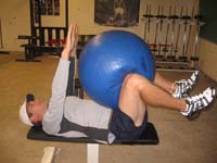 Trunk flexion or "crunch" sit-up is the most popular exercise for conditioning the abdominal region. However, if the crunch sit-up is not performed with additional abdominal exercises like the ones mentioned earlier it could have a detrimental effect on your body over time. When performed correctly, the crunch is a good upper abdominal region strengthening exercise. If the crunch is overused it can lead to a more ridged thoracic spine. It also contributes to a shortened rectus abdominis, which in turn pulls the rib cage towards the pelvis resulting in poor postural alignment. This leads to the inability to extend backward, increasing likelihood of injury and poor posture. Position: Lie on a workout bench. To perform the exercise correctly, maintain proper neutral posture in the cervical spine. Place your tongue on the roof of your mouth preventing shear forces through your cervical spine. Keep the lower back pressed firmly against the floor throughout the exercise. 1. Place your arms straight out toward the ceiling while pinching the Swiss ball between your legs. 2. Moving slowly, contract your rectus abdominis rising up one vertebra at a time. Keep tension in the abdominals at all times. Do not let your chin drop to your chest. A good way to maintain neutral posture in the cervical spine is to pretend your chin is traveling towards the ceiling. Once you have reached full contraction, slowly return to the start position. 3.Once you have reached full contraction, slowly return to the starting position 4. Repeat for the prescribed number of reps (A4) Back Arch