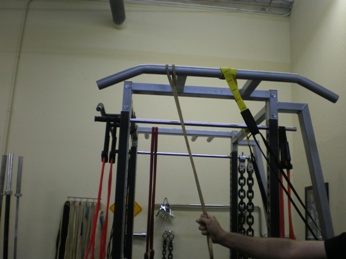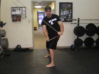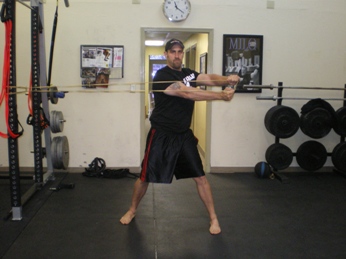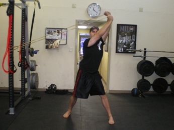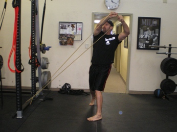 Horizontal Twists: Very simply try to explosively accelerate the band across the body with straight arms. Because of the leverage of the arms and the band your obliques will be toast! Start Finish Like the horizontal twists, the overhead destroys those stubborn obliques. However, because the band is overheat the center of gravity changes making this a more challenging drill. Start Finish An evil twist on