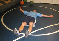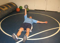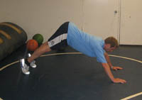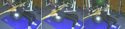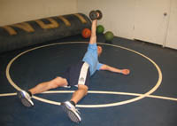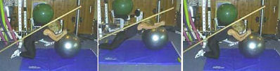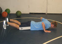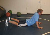"Core In Four" Abdominal Exercises (A1) Swiss Ball Lateral Roll: Note: This exercise requires a Swiss ball and a dowel rod The supine lateral ball roll is an excellent integrative exercise that will challenge anyone - even athletes and advanced exercisers. Position: Sit on the ball and gently rollout so that your trunk is parallel to the floor. The ball should support your head and shoulders. Your feet should be shoulder width apart. Place a dowel rod across your chest and grip it with your palms up. Movement: 1. Slowly slide your right should blade off the ball, keeping the dowel rod parallel to the floor and your hips in a neutral position (do not let your hips drop). As you partially roll off one side of the ball, you will feel the opposite side of your waist and core musculature strongly contract to stabilize your body. 2. Slowly return to the middle position. 3. Gently slide your left shoulder blade off the ball and hold for the allotted time (3 second count). 4. Repeat to roll left and right on the ball for the desired number of reps (A2) 2 Arm Pump: The 2 arm pump develops many muscle groups, including the entire core. It also develops flexibility at the same time. The 2 arm pump may look a bit like a dive bomber push up or a hindu push up. It is similar, but if you look closely, you can see that it's not the same. This movement is like a push up into a low back extension, then the hips are lifted, then the hips are dropped, the chest is dropped to the floor, and the movement is repeated. Position: Lie flat on the floor or exercise mat with your hands flat and pointing forward next to your body at shoulder level. Movement: 1. Gently draw in your belly button to activate your core stabilizing muscles. Slowly push up your chest and arch your back with your head up looking forward. Your lower body should remain in contact with the ground. 2. Slowly push back and elevate your hips toward the ceiling. You head will come down and you will be in a push up position with your pelvis up. 3. Slowly return to the first position and repeat for the prescribed number of reps. Note: This exercise requires a dumbbell or weighted object. The dumbbell arm bar (or "arm bar roll over") improves stability in the shoulder girdle and is great for balance. Position: Lie on your back with a dumbbell in one hand. Place the other arm at 45 degrees to the body toward your head. The dumbbell arm is pointed toward the ceiling. 1. Slowly raise the dumbbell from extended to your side to arms length over your chest. 2. With dummbell at arms length over your body, slowly roll over onto your side (roll toward the open arm side). 3. Cross over your dumbbell side leg, while still keeping your dumbbell arm up toward the ceiling. 4. Roll back over to the starting position and repeat for prescribed reps (A4) Swiss Ball Forward Roll): The swiss ball forward roll is a compound exercise involving many muscles and joint structures. It allows you to integrate full body movement while maintaining good form. (note: the dowel rod is not a requirement - it is being used to illustrate proper spine position.) Position: Set your forearms just below the top of the ball. Movement: 1. Gently draw your belly button in toward your spine to activate your transverse abdominis, which aids in stabilizing your pelvis and lumbar spine. 2. Slowly roll out on the ball until you are fully extended. Make sure your arms and hips move together. Make note of when your rectus abdominis starts to contract strongly. This is your stabilization threshold: do not extend any farther. Use this to determine distance as a benchmark for improvement. 3. Repeat for the prescribed number of reps. "Core In Four" Abdominal Workout Tips: This routine should be performed every other day (three workouts a week). Don't let the looks fool you - it is more challenging than it appears! Remember to focus on form first. Master the exercise form first before adding weights or reps. This program was originally designed for my baseball players and other throwing athletes to improve performance and conditioning. A pleasant side effect they all noticed was better muscle development in the abdominal and waistline region! In my opinion, there's nothing better than being more functional and becoming a better athlete while improving the way you look at the same time! Being that this core program was created for highly conditioned athletes, it was set up as a circuit (sometimes known as a "giant set"), which means all four exercises are done one after another non stop. This makes it an advanced and highly challenging program, however, if you're a beginner or intermediate (I'm assuming most of my readers are not elite athletes), you can still use this workout. All you have to do is rest 60 seconds between exercises as indicated in the chart above.